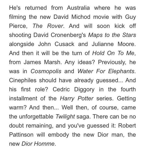 Ele voltou da Austrália, onde ele estava filmando o novo filme de David Michod com Guy Pierce, The Rover. E em breve começará a filmar com David Cronenberg, Maps to the star ao lado de John Cusack e Julianne Moore. E, em seguida, será a vez de Hold On To Me, de James Marsh. Alguma idéia? Anteriormente, ele estava em Cosmopolis e Water For Elephants. Cinéfilos já devem ter adivinhado ... E seu primeiro papel? Cedric Diggory no quarto filme da série Harry Potter. Ficando quente? E depois ... Bem, então, é claro, veio a saga Crepúsculo inesquecível. Não pode haver nenhuma dúvida restante, e você adivinhou: Robert Pattinson vai encarnar o novo homem Dior, o novo Dior Homme.